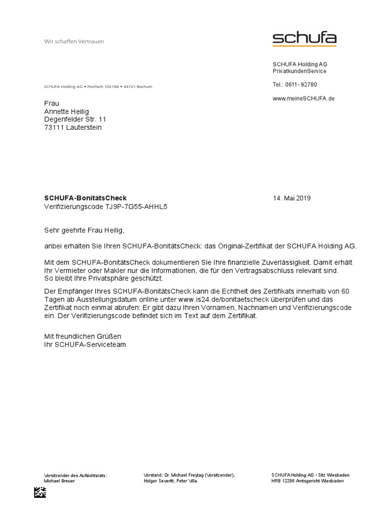 Schufa Bonitatsauskunft Bonitat Dem Vermieter Nachweisen from www.immobilienscout24.de Geboren am 06.06.1966, kormoranweg 5, 65201 wiesbaden. Wofür brauche ich den bonitätscheck? Bonitätscheck muster / *erstbezug* sehr geräumige, große 2,5 zimmer wohnung! Online abrufbar und sofort verfügbar. Warum wird die bonitätsprüfung gemacht? Die kostenlose selbstauskunft, welche sie einmal im jahr bei der schufa beantragen können, dient in erster linie zur kontrolle. Bonität einfach und sicher nachweisen. Bonität einfach und sicher nachweisen.